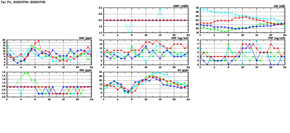 | Air Quality Data Time Series in Tai Po (2020/07/08) | ( Line colors: Day -3 Day -2 Day -1 Current day ) | 2D Map Current AQHI |