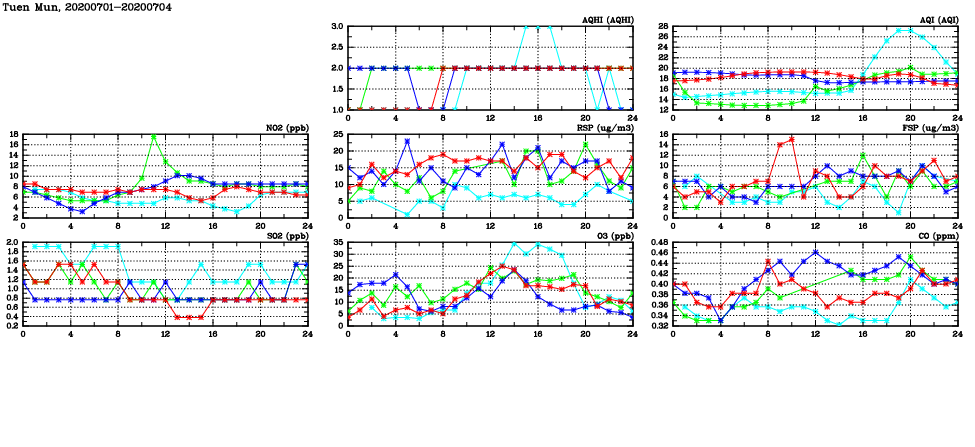| Air Quality Data Time Series in Tuen Mun (2020/07/04) | ( Line colors: Day -3 Day -2 Day -1 Current day ) | 2D Map Current AQHI |