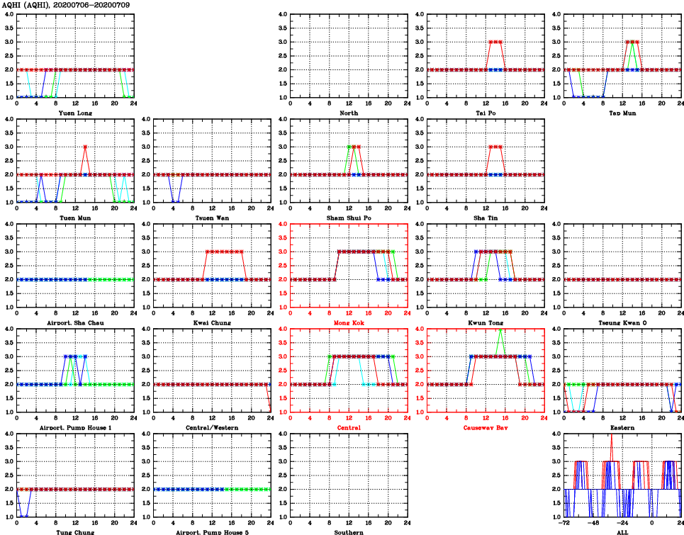 | Air Quality Data Time Series for AQHI (2020/07/09) | ( Line colors: Day -3 Day -2 Day -1 Current day ) | 2D Map Current AQHI |