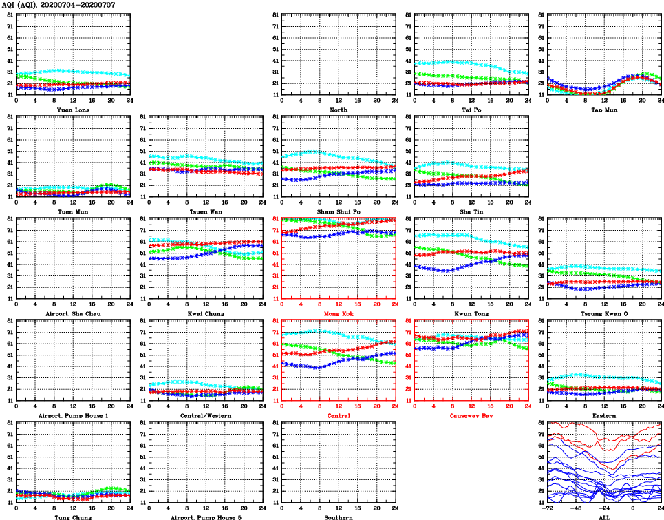 | Air Quality Data Time Series for AQI (2020/07/07) | ( Line colors: Day -3 Day -2 Day -1 Current day ) | 2D Map Current AQHI |