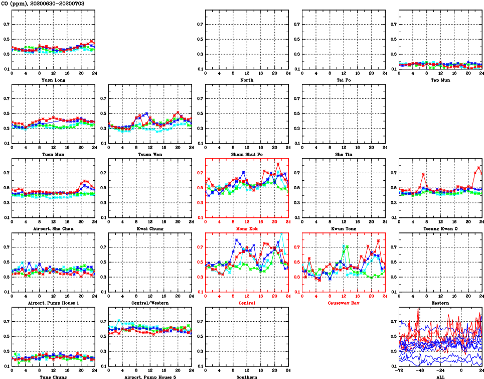 | Air Quality Data Time Series for CO (2020/07/03) | ( Line colors: Day -3 Day -2 Day -1 Current day ) | 2D Map Current AQHI |