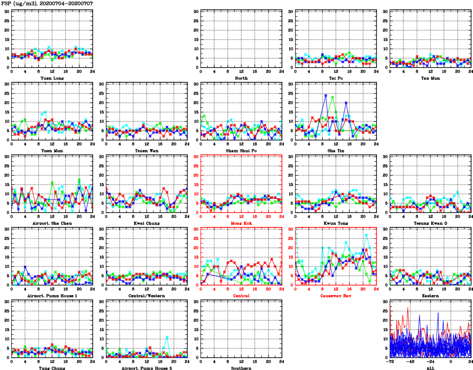 | Air Quality Data Time Series for FSP (2020/07/07) | ( Line colors: Day -3 Day -2 Day -1 Current day ) | 2D Map Current AQHI |