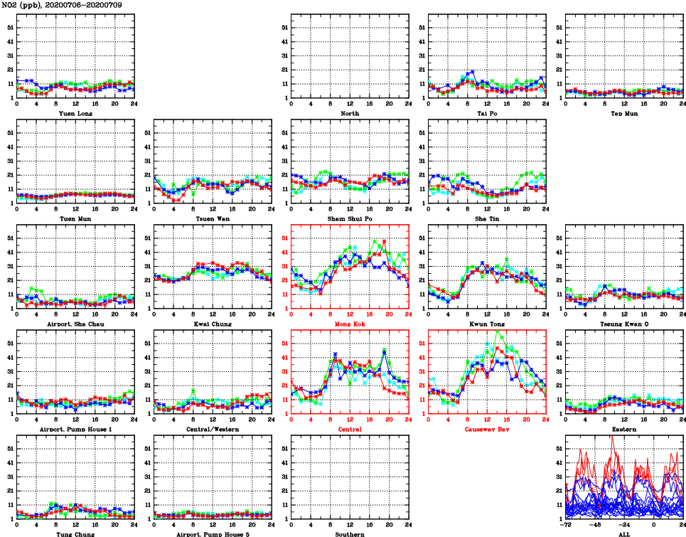 | Air Quality Data Time Series for NO2 (2020/07/09) | ( Line colors: Day -3 Day -2 Day -1 Current day ) | 2D Map Current AQHI |