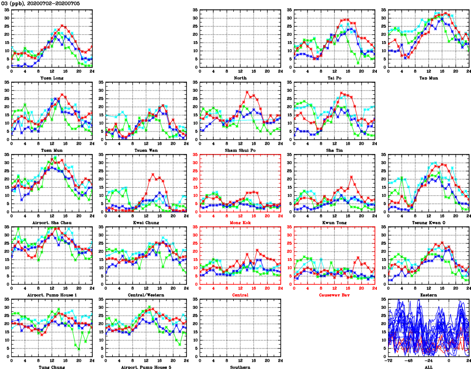 | Air Quality Data Time Series for O3 (2020/07/05) | ( Line colors: Day -3 Day -2 Day -1 Current day ) | 2D Map Current AQHI |