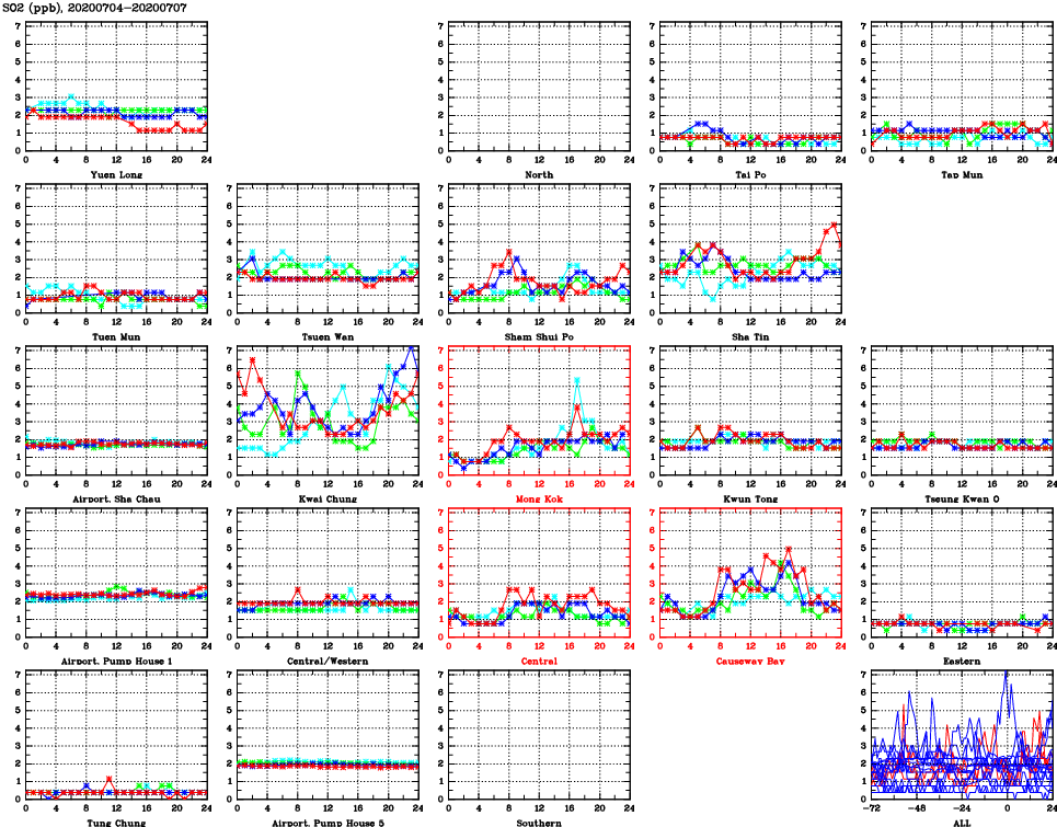 | Air Quality Data Time Series for SO2 (2020/07/07) | ( Line colors: Day -3 Day -2 Day -1 Current day ) | 2D Map Current AQHI |