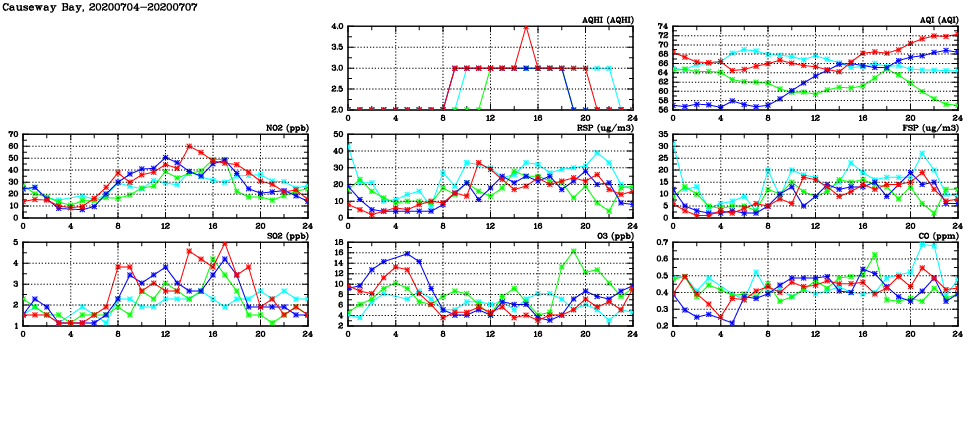 | Air Quality Data Time Series in Causeway Bay (2020/07/07) | ( Line colors: Day -3 Day -2 Day -1 Current day ) | 2D Map Current AQHI |