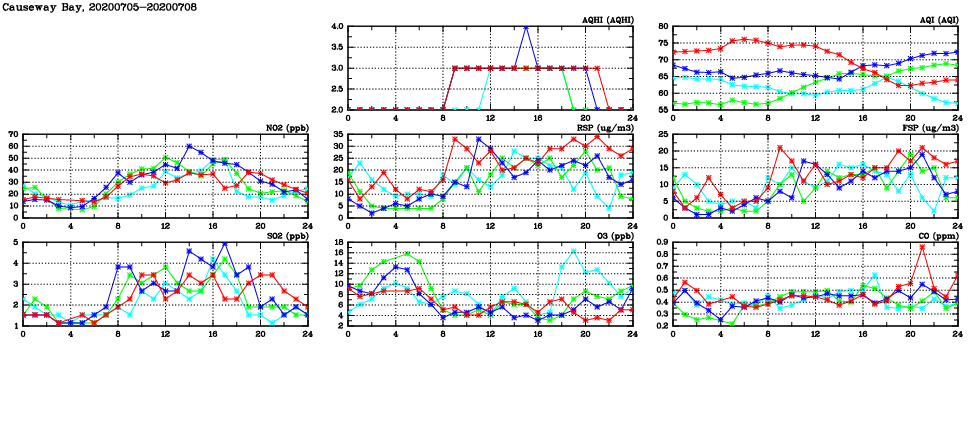 | Air Quality Data Time Series in Causeway Bay (2020/07/08) | ( Line colors: Day -3 Day -2 Day -1 Current day ) | 2D Map Current AQHI |
