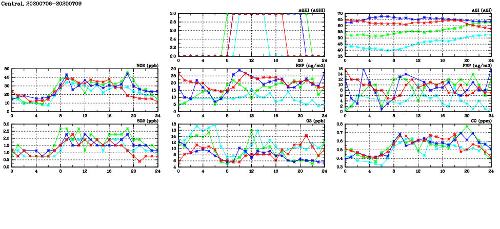 | Air Quality Data Time Series in Central (2020/07/09) | ( Line colors: Day -3 Day -2 Day -1 Current day ) | 2D Map Current AQHI |