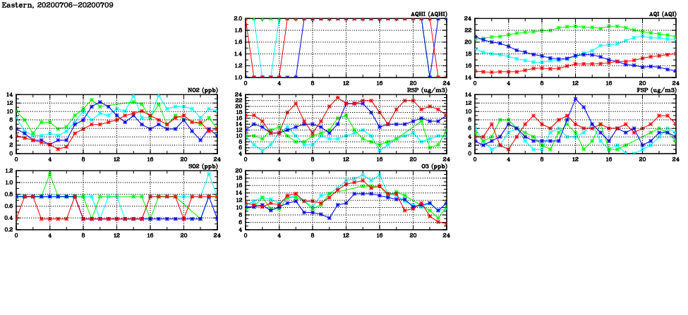 | Air Quality Data Time Series in Eastern (2020/07/09) | ( Line colors: Day -3 Day -2 Day -1 Current day ) | 2D Map Current AQHI |