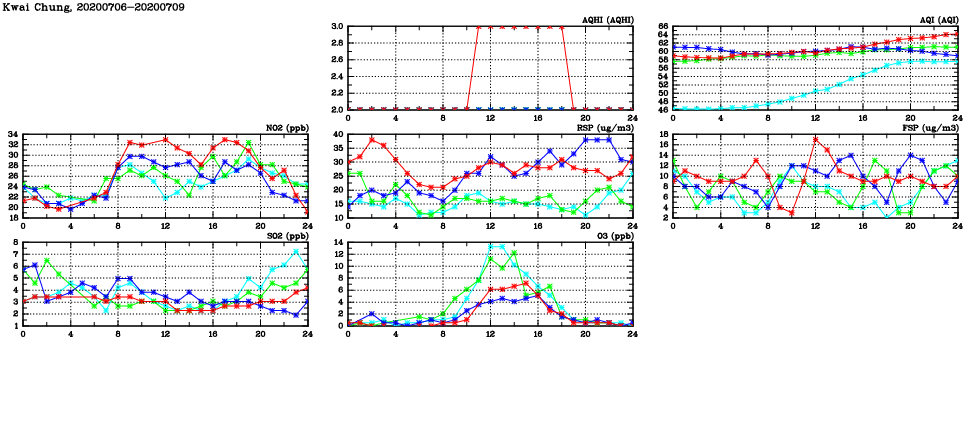 | Air Quality Data Time Series in Kwai Chung (2020/07/09) | ( Line colors: Day -3 Day -2 Day -1 Current day ) | 2D Map Current AQHI |