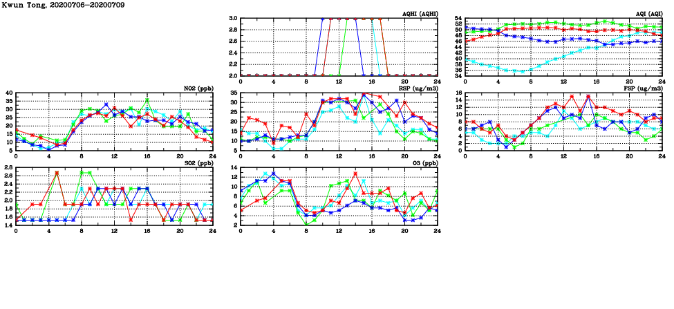 | Air Quality Data Time Series in Kwun Tong (2020/07/09) | ( Line colors: Day -3 Day -2 Day -1 Current day ) | 2D Map Current AQHI |