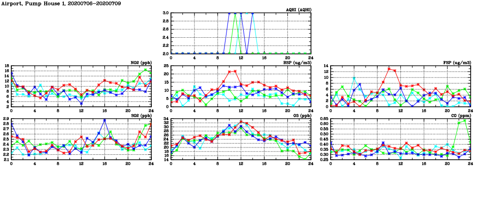 | Air Quality Data Time Series in Airport, Pump House 1 (2020/07/09) | ( Line colors: Day -3 Day -2 Day -1 Current day ) | 2D Map Current AQHI |