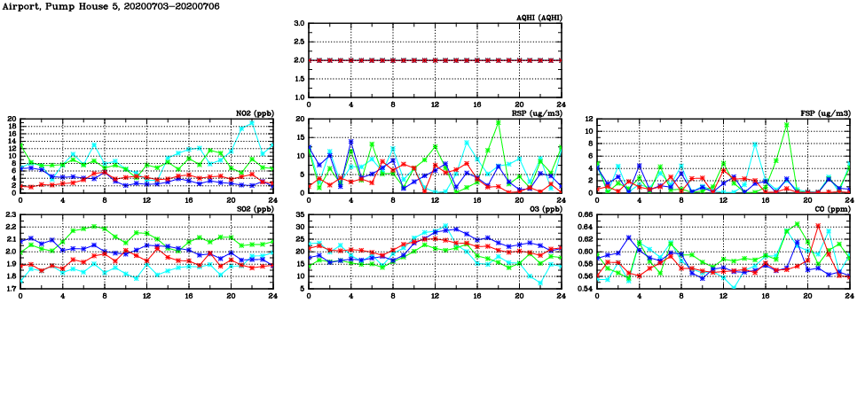 | Air Quality Data Time Series in Airport, Pump House 5 (2020/07/06) | ( Line colors: Day -3 Day -2 Day -1 Current day ) | 2D Map Current AQHI |