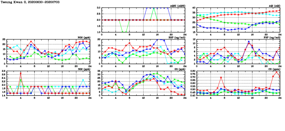| Air Quality Data Time Series in Tseung Kwan O (2020/07/03) | ( Line colors: Day -3 Day -2 Day -1 Current day ) | 2D Map Current AQHI |