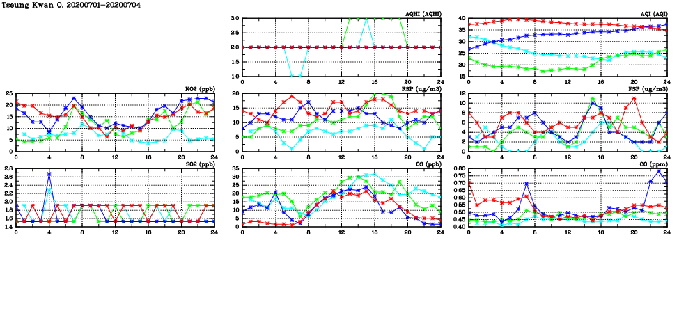 | Air Quality Data Time Series in Tseung Kwan O (2020/07/04) | ( Line colors: Day -3 Day -2 Day -1 Current day ) | 2D Map Current AQHI |