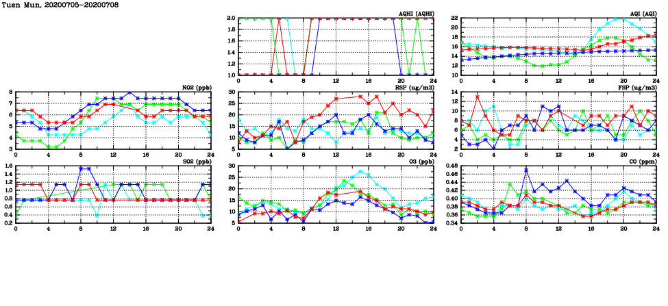 | Air Quality Data Time Series in Tuen Mun (2020/07/08) | ( Line colors: Day -3 Day -2 Day -1 Current day ) | 2D Map Current AQHI |