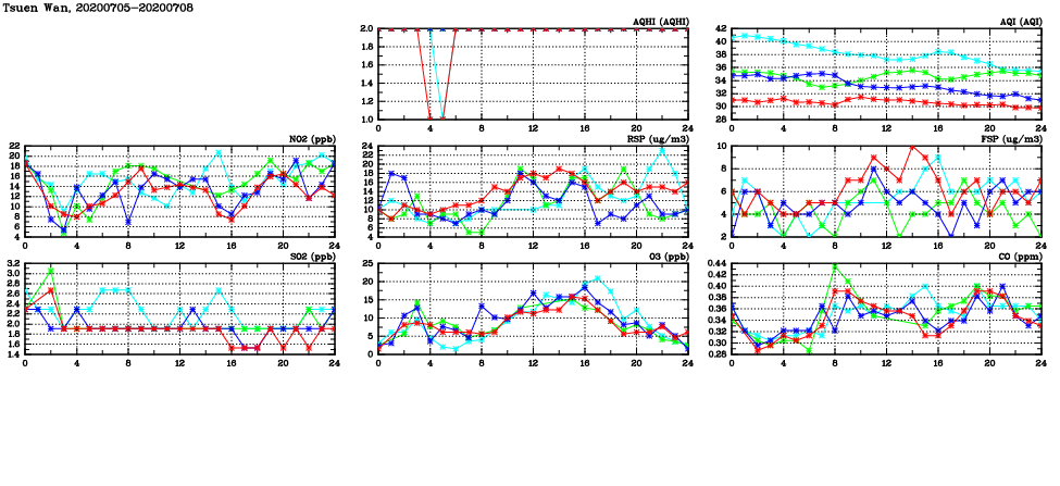 | Air Quality Data Time Series in Tsuen Wan (2020/07/08) | ( Line colors: Day -3 Day -2 Day -1 Current day ) | 2D Map Current AQHI |