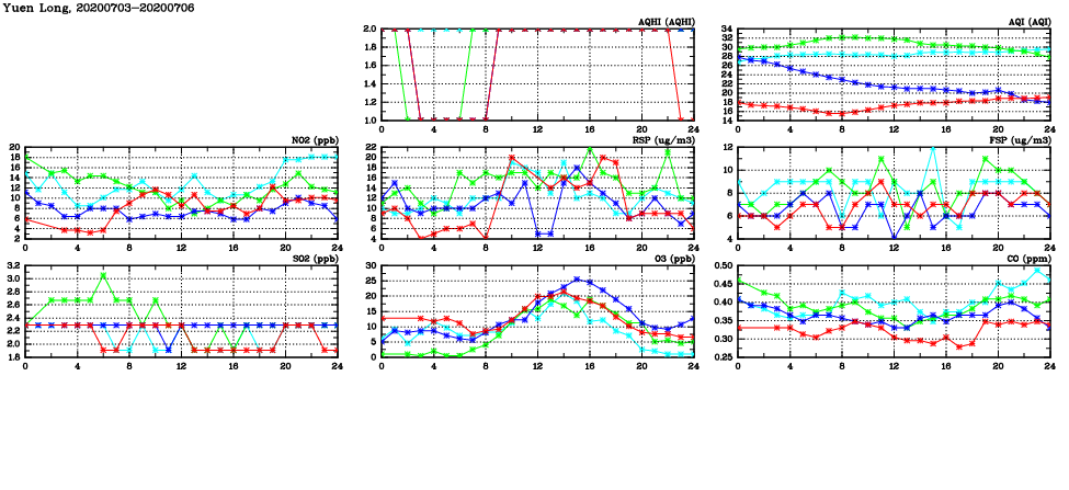| Air Quality Data Time Series in Yuen Long (2020/07/06) | ( Line colors: Day -3 Day -2 Day -1 Current day ) | 2D Map Current AQHI |
