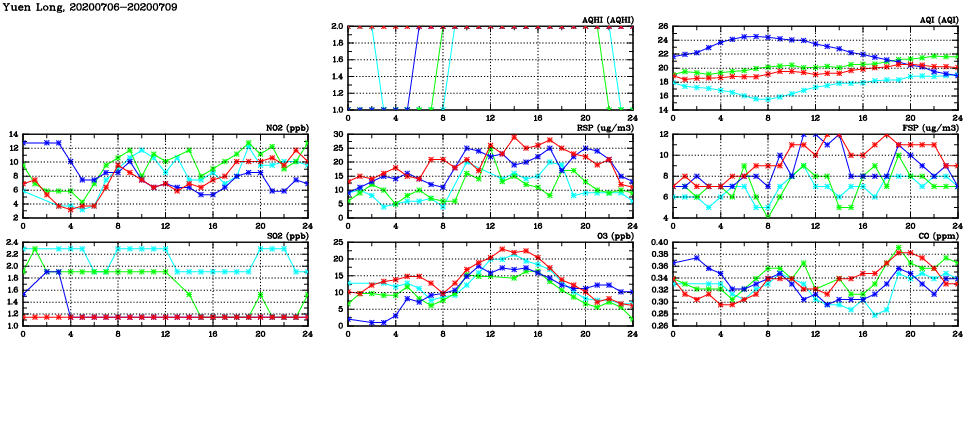 | Air Quality Data Time Series in Yuen Long (2020/07/09) | ( Line colors: Day -3 Day -2 Day -1 Current day ) | 2D Map Current AQHI |