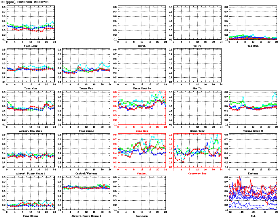 | Air Quality Data Time Series for CO (2020/07/06) | ( Line colors: Day -3 Day -2 Day -1 Current day ) | 2D Map Current AQHI |