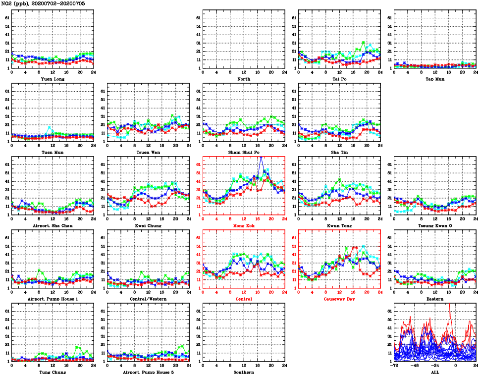 | Air Quality Data Time Series for NO2 (2020/07/05) | ( Line colors: Day -3 Day -2 Day -1 Current day ) | 2D Map Current AQHI |