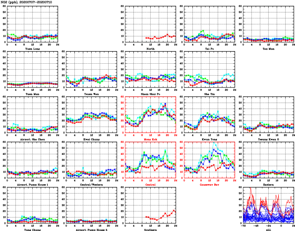 | Air Quality Data Time Series for NO2 (2020/07/10) | ( Line colors: Day -3 Day -2 Day -1 Current day ) | 2D Map Current AQHI |