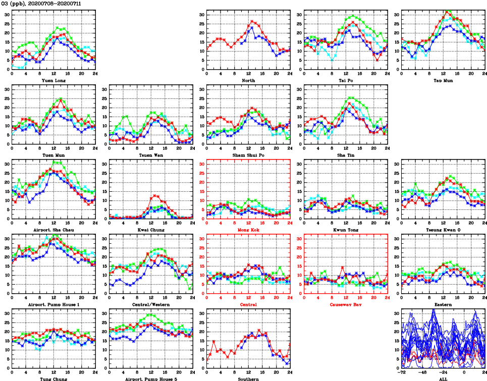 | Air Quality Data Time Series for O3 (2020/07/11) | ( Line colors: Day -3 Day -2 Day -1 Current day ) | 2D Map Current AQHI |