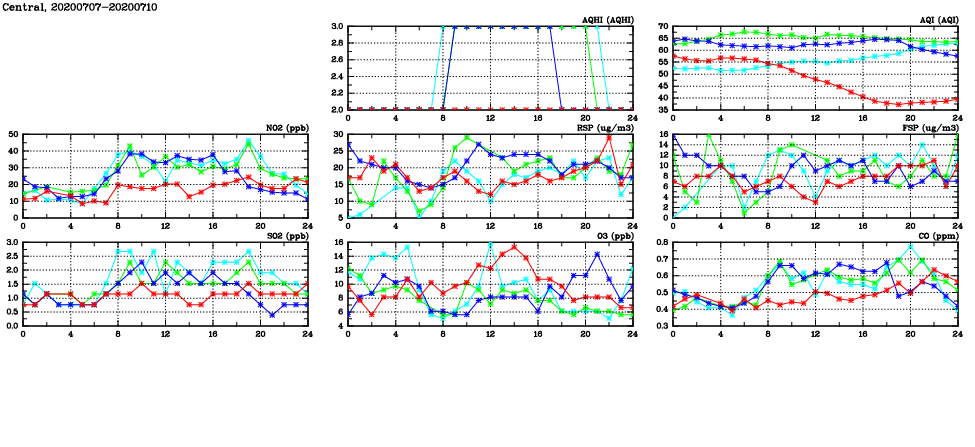| Air Quality Data Time Series in Central (2020/07/10) | ( Line colors: Day -3 Day -2 Day -1 Current day ) | 2D Map Current AQHI |