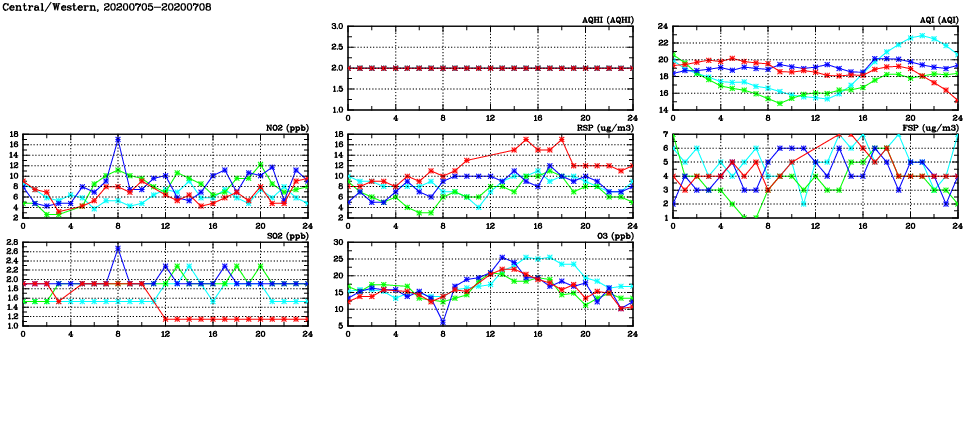 | Air Quality Data Time Series in Central/Western (2020/07/08) | ( Line colors: Day -3 Day -2 Day -1 Current day ) | 2D Map Current AQHI |
