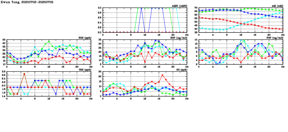 | Air Quality Data Time Series in Kwun Tong (2020/07/05) | ( Line colors: Day -3 Day -2 Day -1 Current day ) | 2D Map Current AQHI |