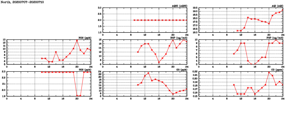 | Air Quality Data Time Series in North (2020/07/10) | ( Line colors: Day -3 Day -2 Day -1 Current day ) | 2D Map Current AQHI |