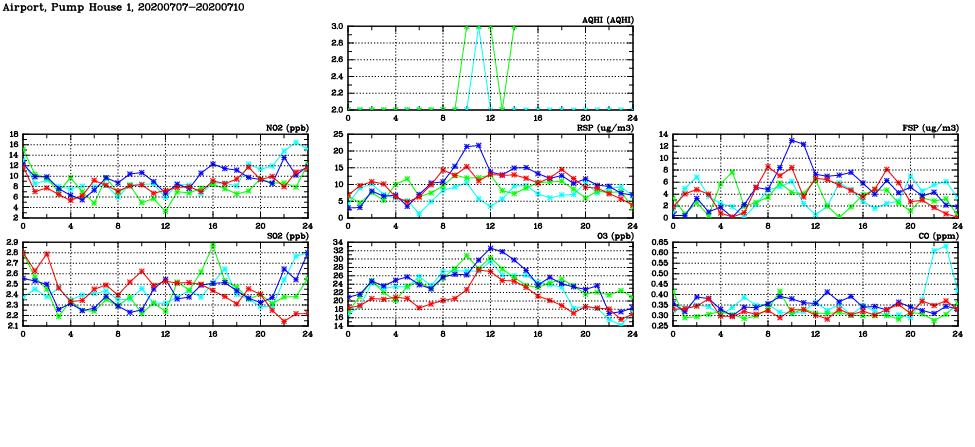 | Air Quality Data Time Series in Airport, Pump House 1 (2020/07/10) | ( Line colors: Day -3 Day -2 Day -1 Current day ) | 2D Map Current AQHI |