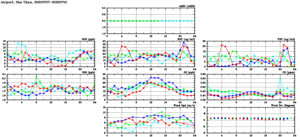| Air Quality Data Time Series in Airport, Sha Chau (2020/07/10) | ( Line colors: Day -3 Day -2 Day -1 Current day ) | 2D Map Current AQHI |