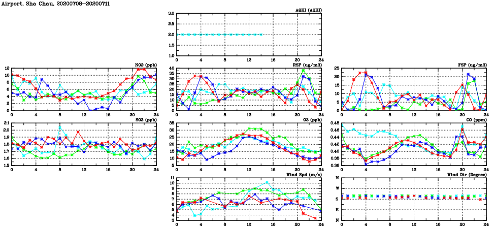 | Air Quality Data Time Series in Airport, Sha Chau (2020/07/11) | ( Line colors: Day -3 Day -2 Day -1 Current day ) | 2D Map Current AQHI |