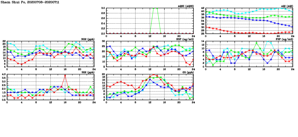 | Air Quality Data Time Series in Sham Shui Po (2020/07/11) | ( Line colors: Day -3 Day -2 Day -1 Current day ) | 2D Map Current AQHI |