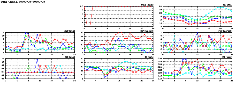 | Air Quality Data Time Series in Tung Chung (2020/07/08) | ( Line colors: Day -3 Day -2 Day -1 Current day ) | 2D Map Current AQHI |