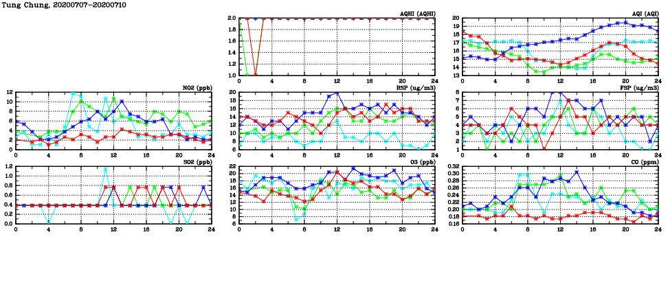 | Air Quality Data Time Series in Tung Chung (2020/07/10) | ( Line colors: Day -3 Day -2 Day -1 Current day ) | 2D Map Current AQHI |