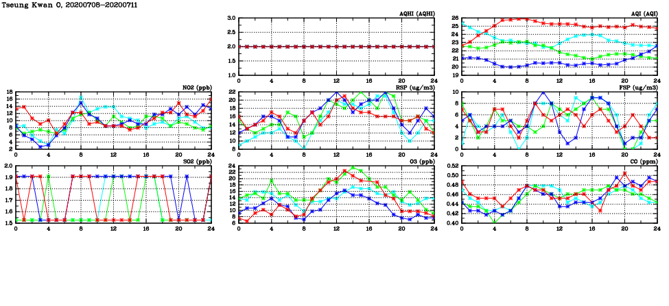 | Air Quality Data Time Series in Tseung Kwan O (2020/07/11) | ( Line colors: Day -3 Day -2 Day -1 Current day ) | 2D Map Current AQHI |