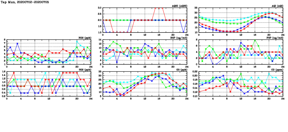 | Air Quality Data Time Series in Tap Mun (2020/07/05) | ( Line colors: Day -3 Day -2 Day -1 Current day ) | 2D Map Current AQHI |