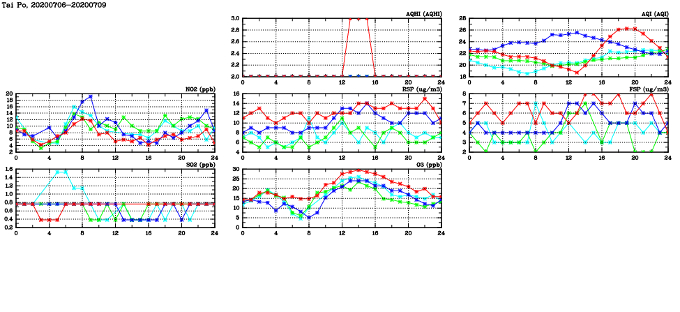 | Air Quality Data Time Series in Tai Po (2020/07/09) | ( Line colors: Day -3 Day -2 Day -1 Current day ) | 2D Map Current AQHI |