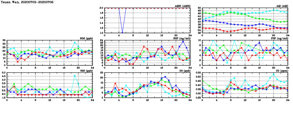 | Air Quality Data Time Series in Tsuen Wan (2020/07/06) | ( Line colors: Day -3 Day -2 Day -1 Current day ) | 2D Map Current AQHI |
