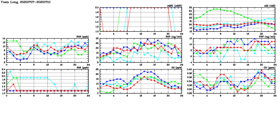 | Air Quality Data Time Series in Yuen Long (2020/07/10) | ( Line colors: Day -3 Day -2 Day -1 Current day ) | 2D Map Current AQHI |