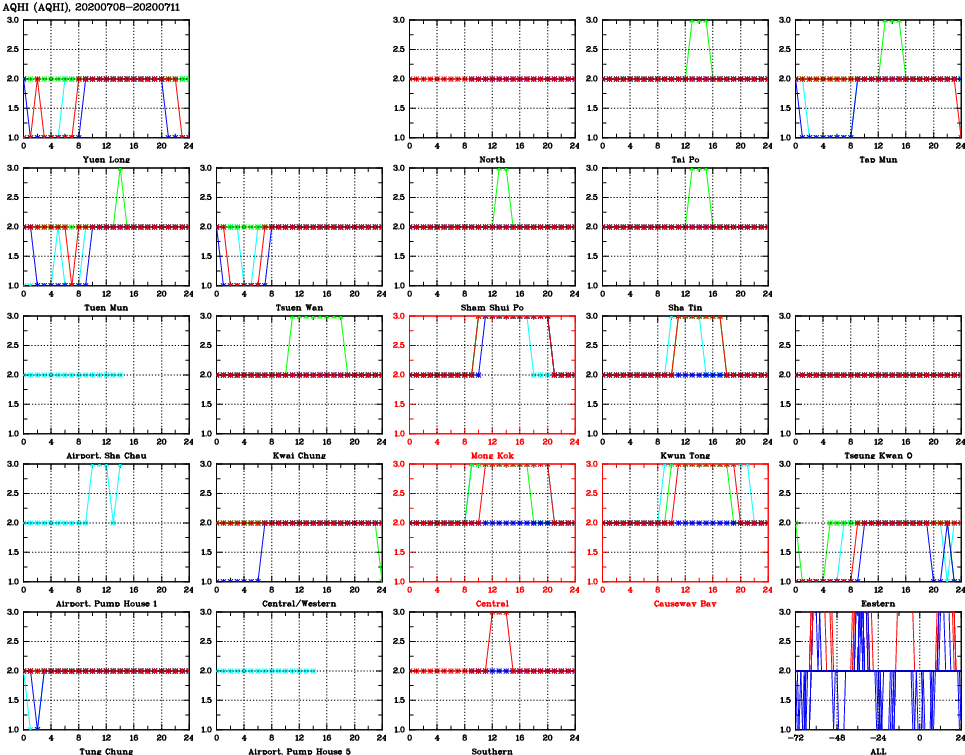 | Air Quality Data Time Series for AQHI (2020/07/11) | ( Line colors: Day -3 Day -2 Day -1 Current day ) | 2D Map Current AQHI |