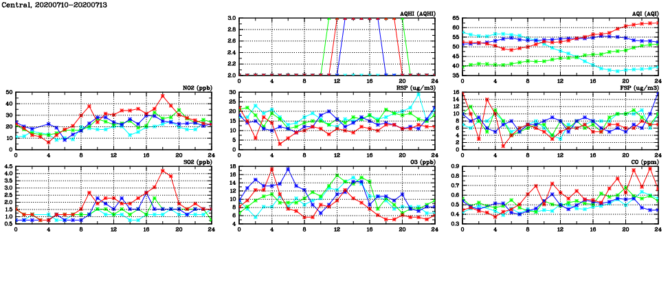 | Air Quality Data Time Series in Central (2020/07/13) | ( Line colors: Day -3 Day -2 Day -1 Current day ) | 2D Map Current AQHI |