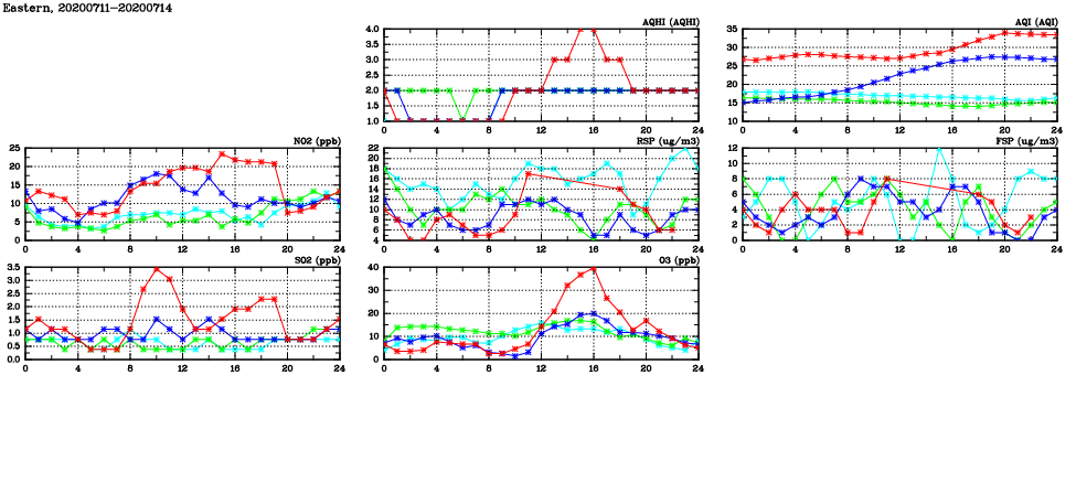 | Air Quality Data Time Series in Eastern (2020/07/14) | ( Line colors: Day -3 Day -2 Day -1 Current day ) | 2D Map Current AQHI |