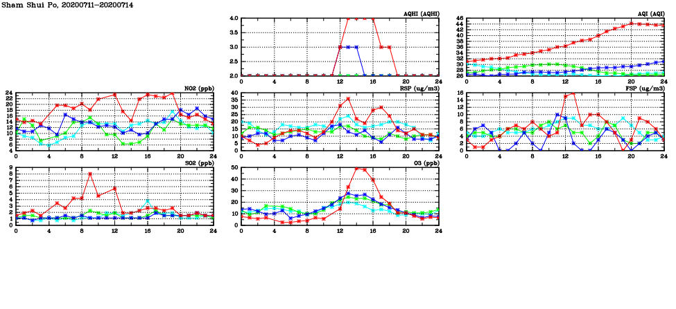 | Air Quality Data Time Series in Sham Shui Po (2020/07/14) | ( Line colors: Day -3 Day -2 Day -1 Current day ) | 2D Map Current AQHI |
