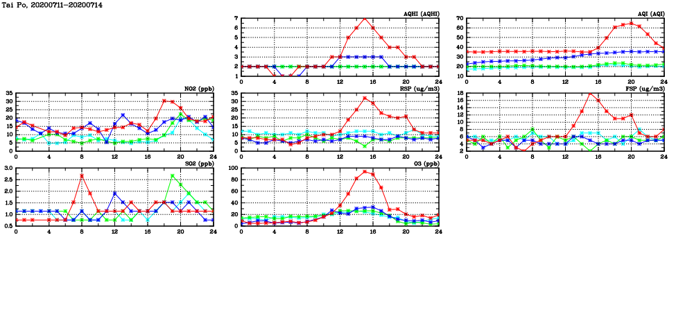 | Air Quality Data Time Series in Tai Po (2020/07/14) | ( Line colors: Day -3 Day -2 Day -1 Current day ) | 2D Map Current AQHI |