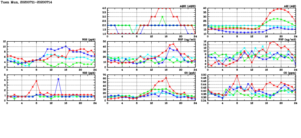 | Air Quality Data Time Series in Tuen Mun (2020/07/14) | ( Line colors: Day -3 Day -2 Day -1 Current day ) | 2D Map Current AQHI |