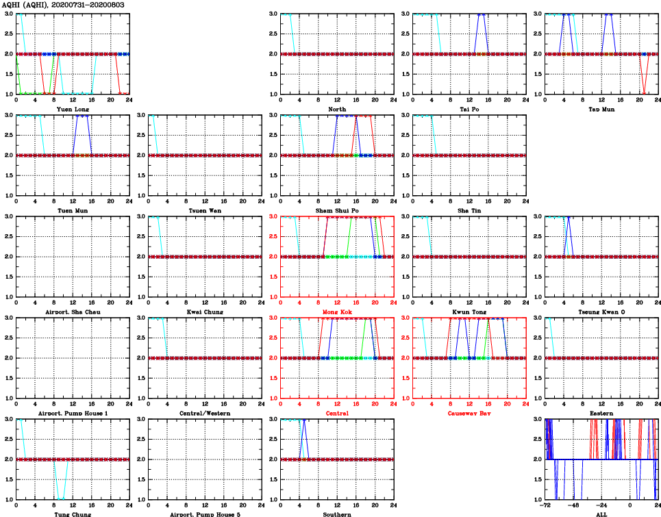 | Air Quality Data Time Series for AQHI (2020/08/03) | ( Line colors: Day -3 Day -2 Day -1 Current day ) | 2D Map Current AQHI |