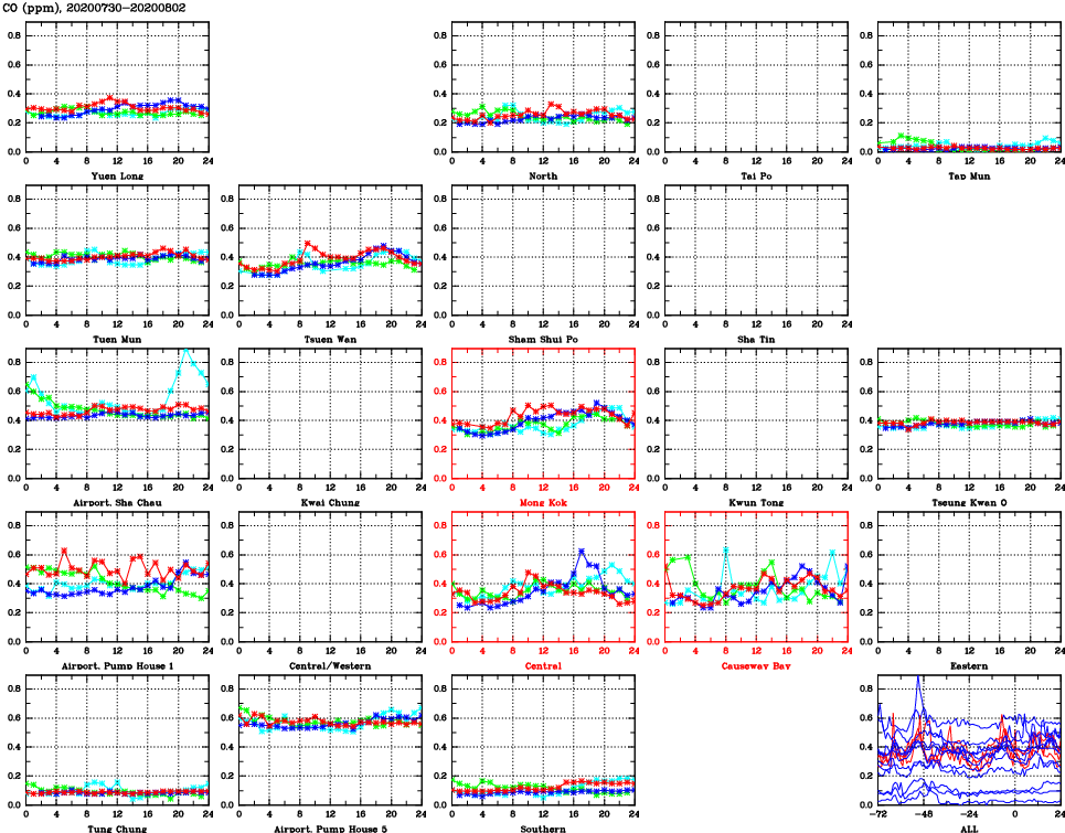 | Air Quality Data Time Series for CO (2020/08/02) | ( Line colors: Day -3 Day -2 Day -1 Current day ) | 2D Map Current AQHI |